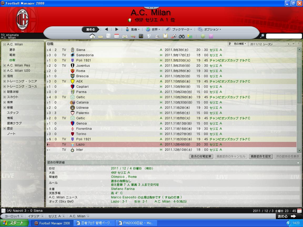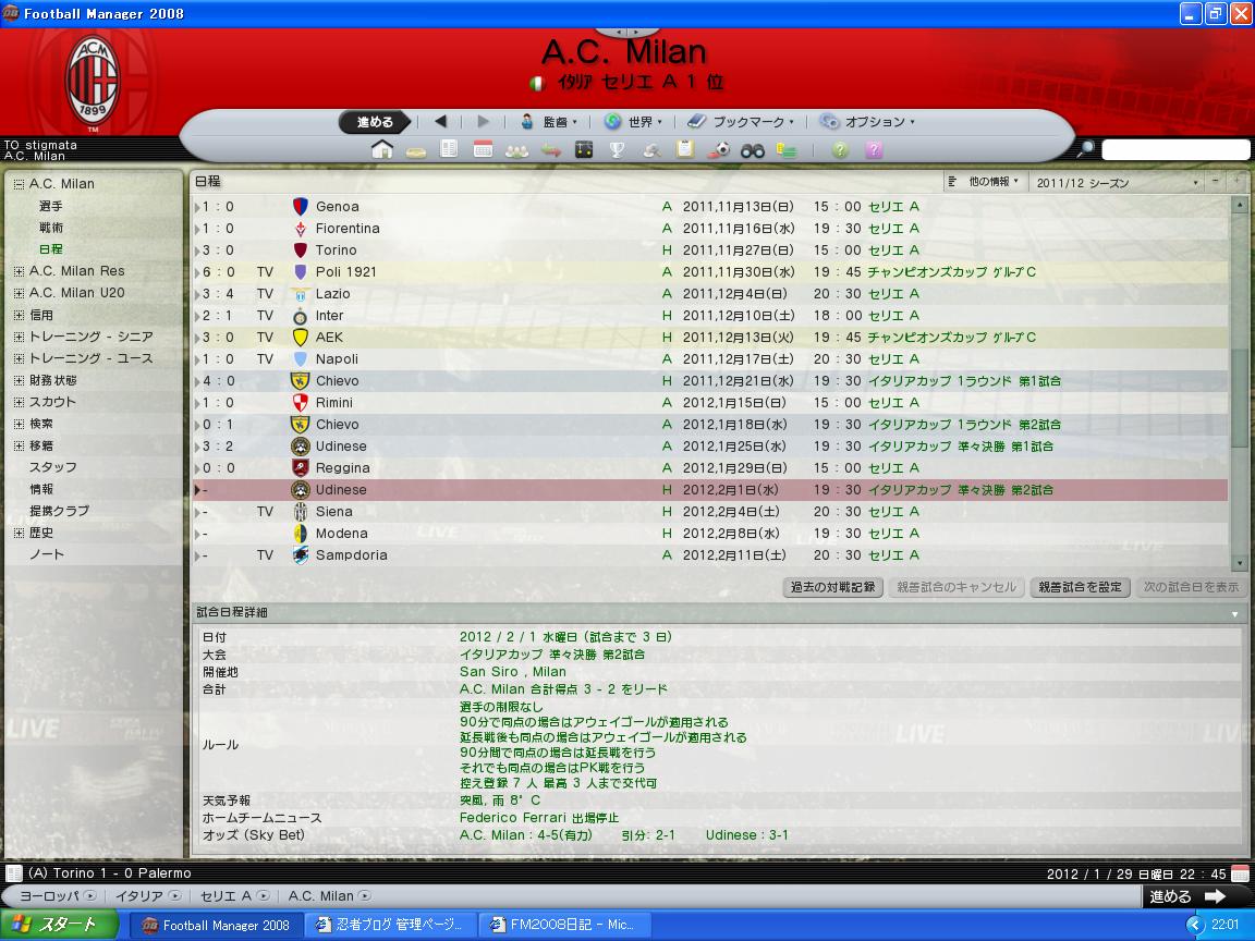 12月後半からイタリアカップ開始。セリエに少し余裕があるので、カップ戦に戦力回せるかも(*´д`*)
